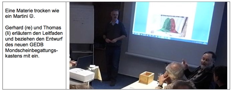 Gerhard (re) und Thomas (li) erläutern den Leitfaden und beziehen den Entwurf des neuen GEDB Mondscheinbegattungs- kastens mit ein.